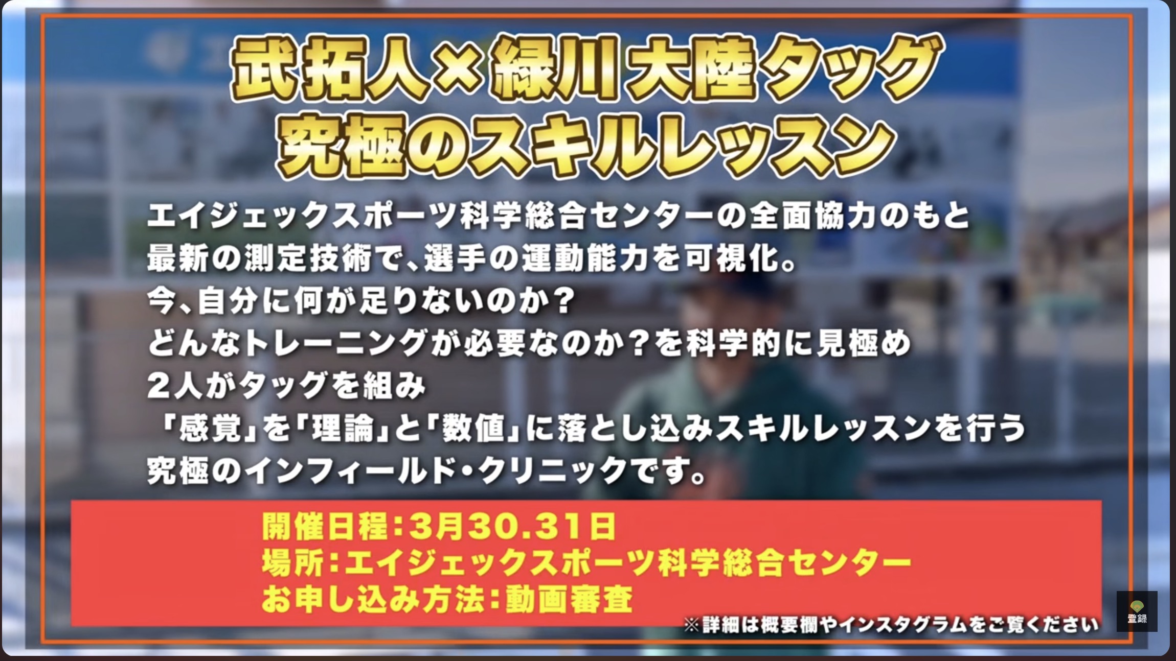 この度、キャッチャーコーチの緑川と、守備コーチの武がタッグを組み、小中学生を対象とした特別な野球スキルレッスンを開催することが決定いたしました!